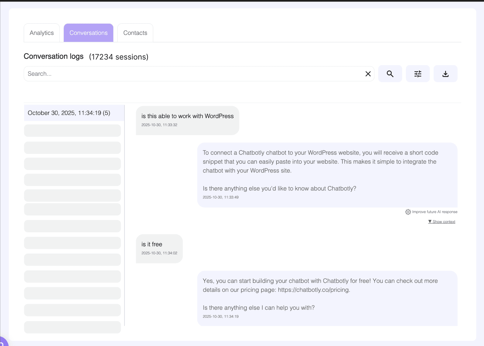 Monitor your chat history to get insights about your users and improve your AI Assistant.