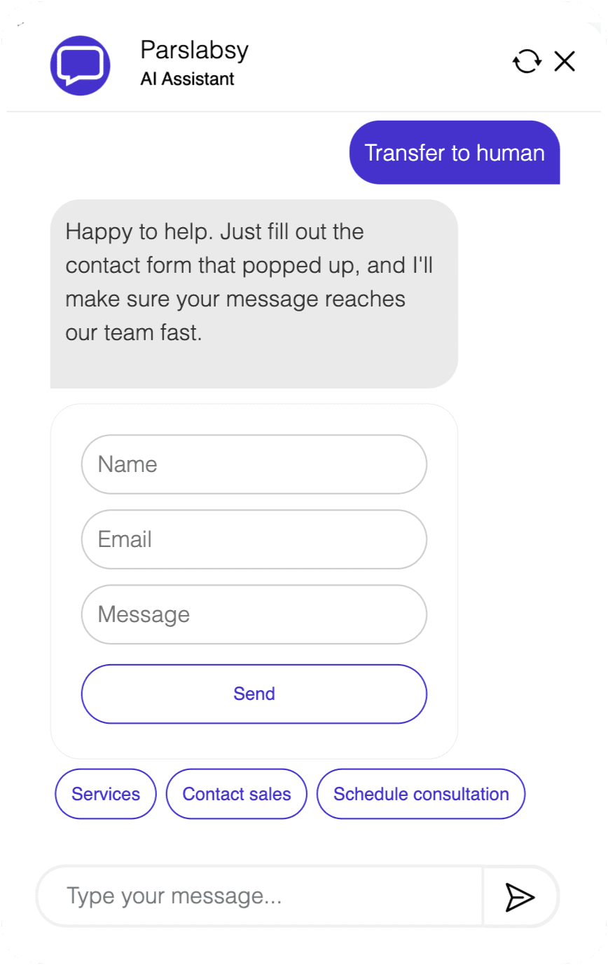 Chatbotly automatically detects when human input is needed and smoothly hands off conversations to your team.